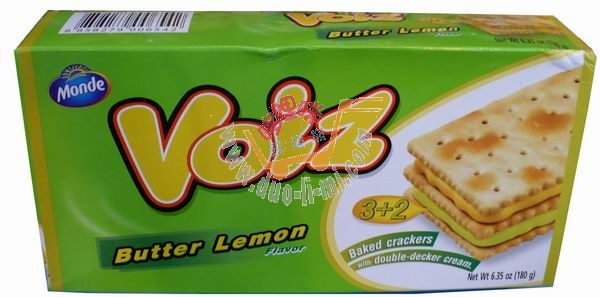 品 名:沃伊思復合牛油檸檬味味3+2梳打夾心餅干/180克 進口食品批發(fā)